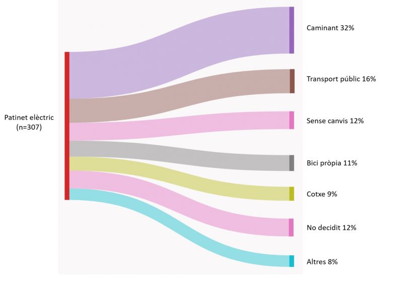 Preguntadas por cómo adaptarían su desplazamiento después de la prohibición, más de un 40% de las personas encuestadas respondió que haría la etapa que hasta ahora cubría en patinete eléctrico en modos activos (31% caminando y 10% en bicicleta propia), un 16% optaría por más transporte público Y solo un 9% declaró que haría el viaje en coche.