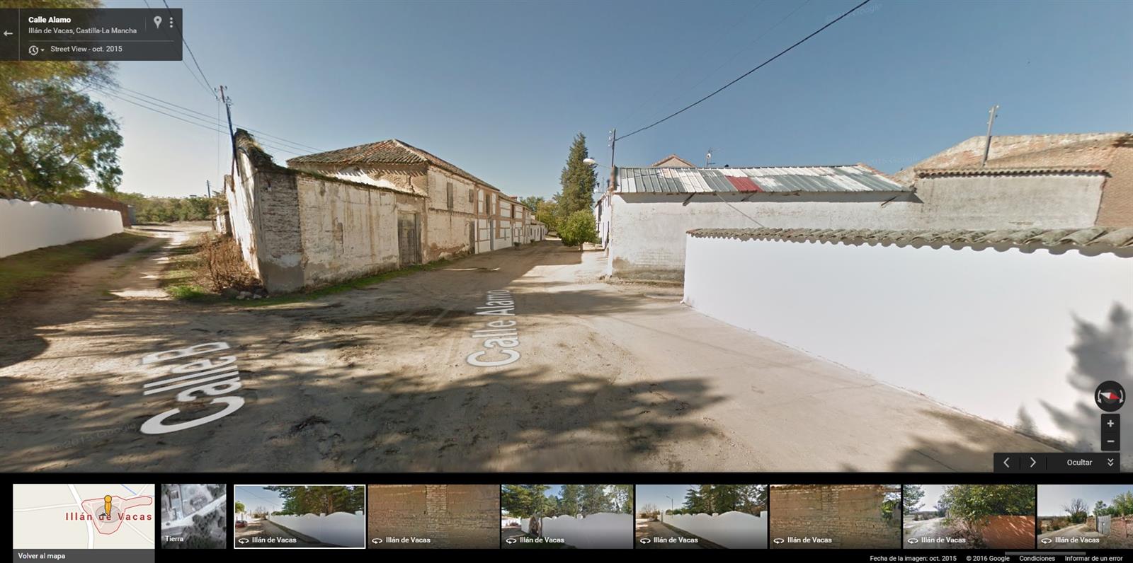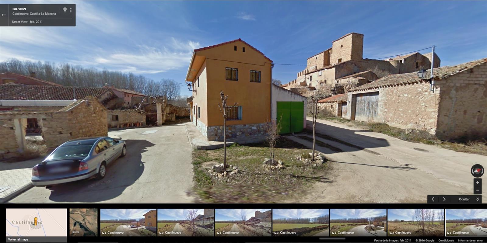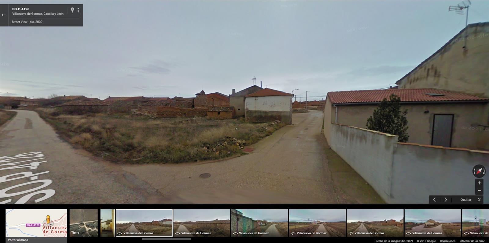 La misma situación ocurre con otro municipio de Soria de también 10 habitantes según el INE, Villanueva de Gormaz. Google no tiene imágenes del interior del pueblo como tal, pero sí que pasa por la carretera que lo rodea, dejando ver la antigüedad de las casas. Mires donde mires en Street View, sorprende que el pueblo esté absolutamente rodeado de campo hasta donde abarca la vista.