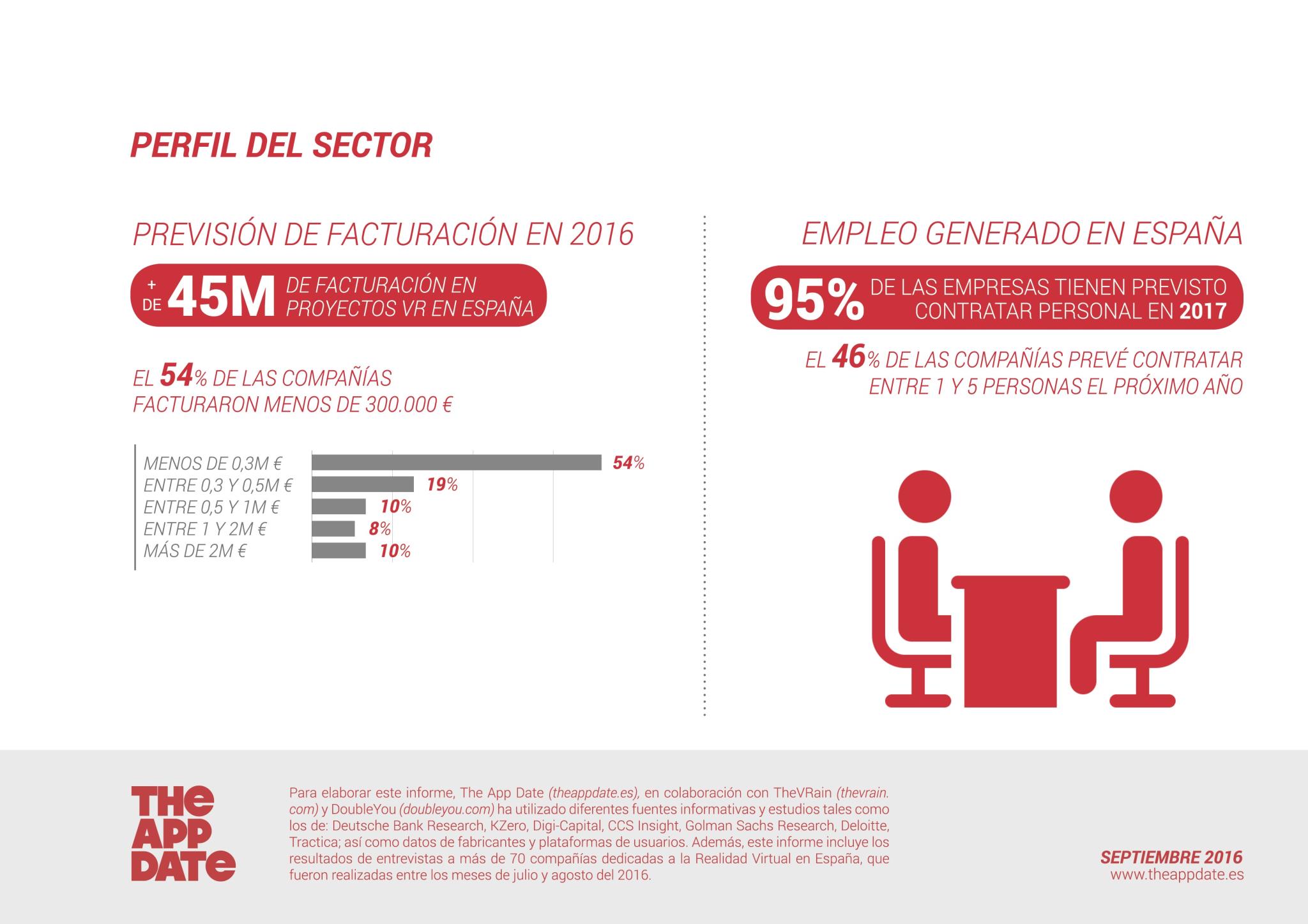 El año 2016, según el informe elaborado por The App Date, cerrará con más de 45 millones de euros de facturación derivados de proyectos de realidad virtual en España. Pese a la buena cifra global, la mitad de las compañías dedicadas a este ámbito (un 54%) facturó menos de 300.000 euros.